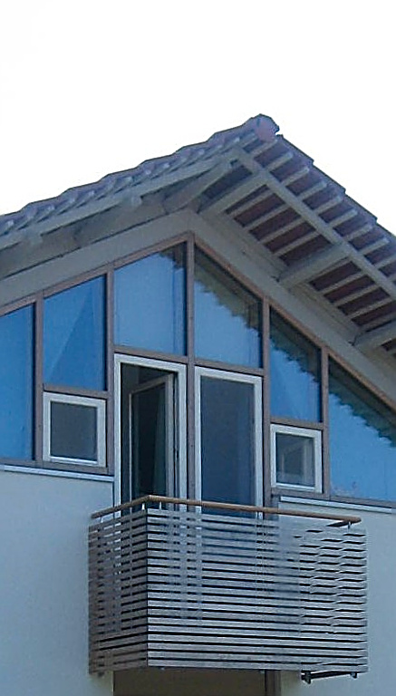 Das Niedrigenergiehaus mit integrierter Bürofläche und Garage wurde mit einem langen und schmalen Hauptbaukörper und mit einem vom Garten her 2- geschossigen Anbau entworfen. Der Hauptbaukörper wird mit einem Satteldach, der Anbau mit einem extensiv begrünten Pultdach überdeckt. Konzipiert wurde die kalte Nord-Ostseite mit einem speicherhaltigen verputzten Massivbau. Die offene und transparente Süd-Westseite wurde als Holzbau mit Holz-Pfosten-Riegelfassade und Holzrautenschalung aus Zedernholz ausgeführt. Im Hanggeschoss befindet sich nach Süden ausgerichtet die Büronutzung mit ca. 80m². Ökologische Baustoffe und energieeffiziente Technik, wie Sole-Wasser-Wärmepumpe, Regenwassernutzung und PV-Anlage ergeben zusammen ein nachhaltiges Gebäudekonzept.